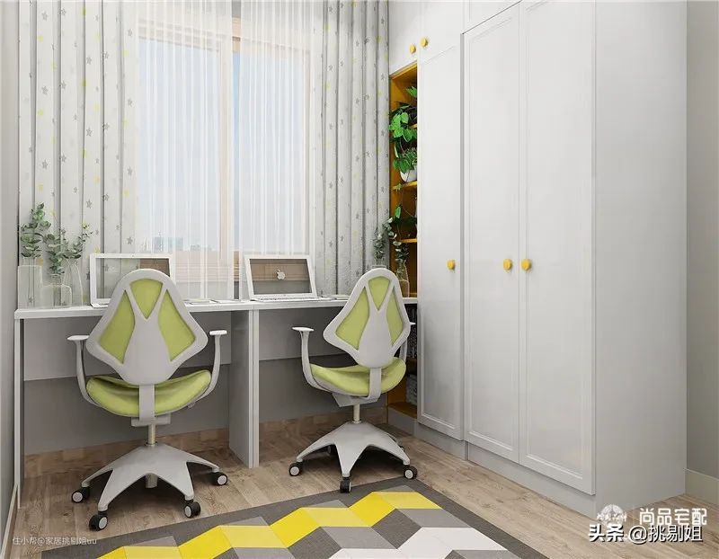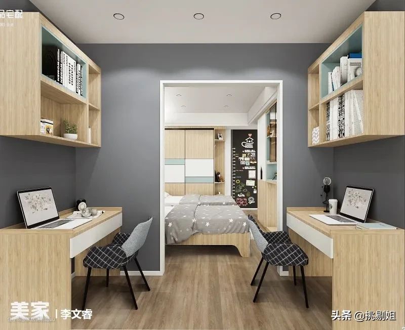 △ 如果儿童房够大,还可以单独设计两张书桌,或者转角双人书桌,台面更加宽敞,两个孩子既能互相陪伴学习,又有相对独立的空间。