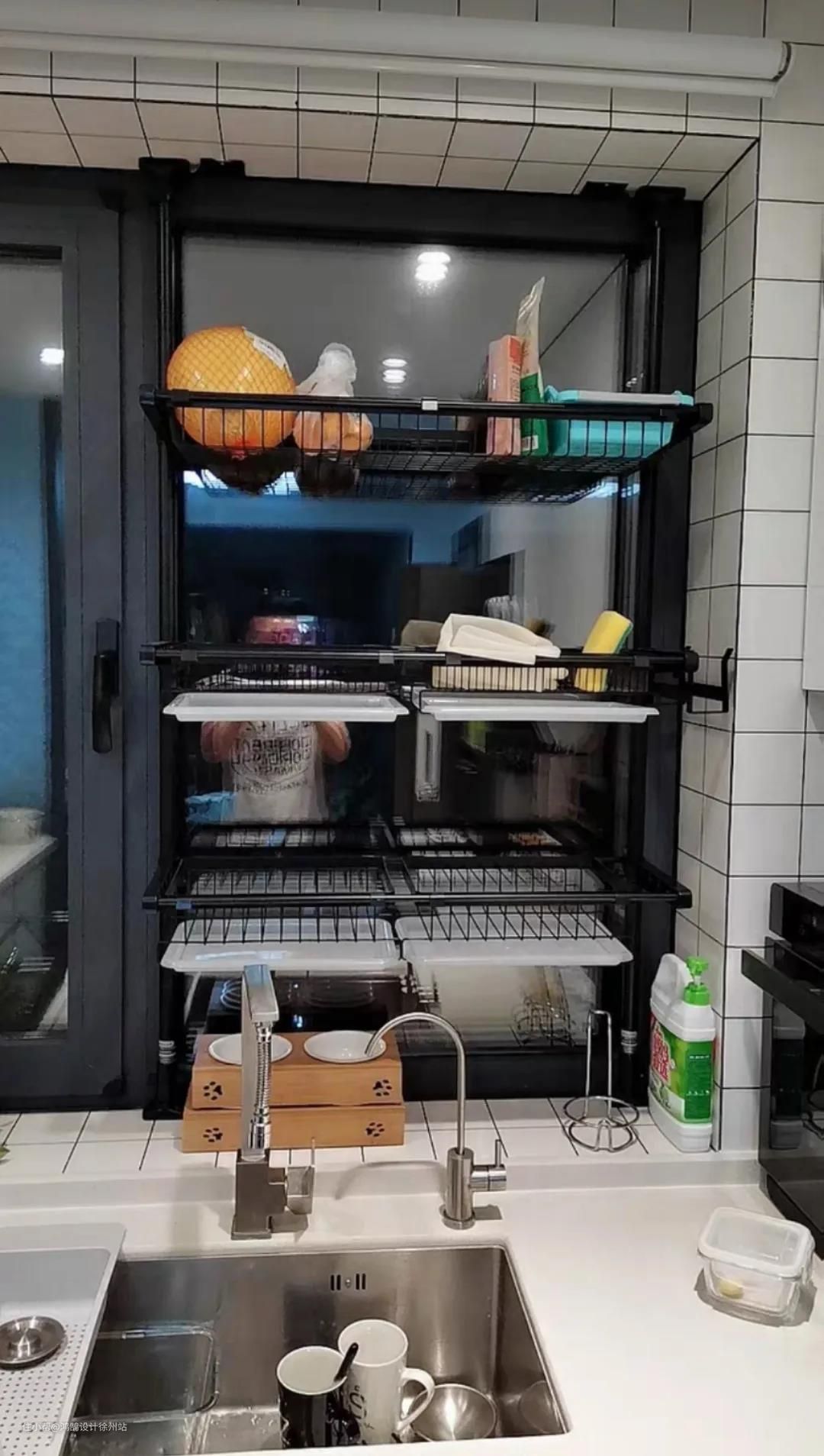 厨房水槽区域的上方往往面对窗户,利用顶天立地置物架,收纳空间翻倍,厨房窗台的空间马上利用起来,再也不会乱糟糟了。