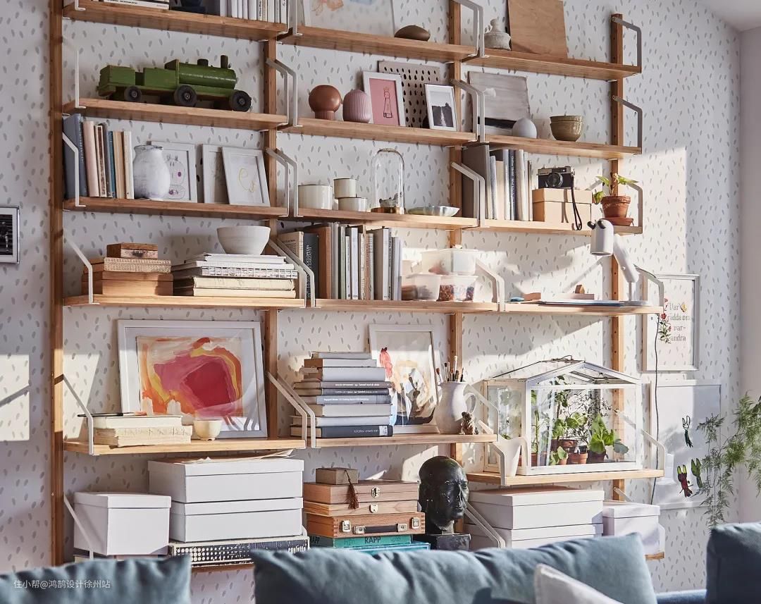 除了宜家,还可以试试木色的挂墙柜系统,区别于厚重的封闭定制柜,更加通透和容易搭配。