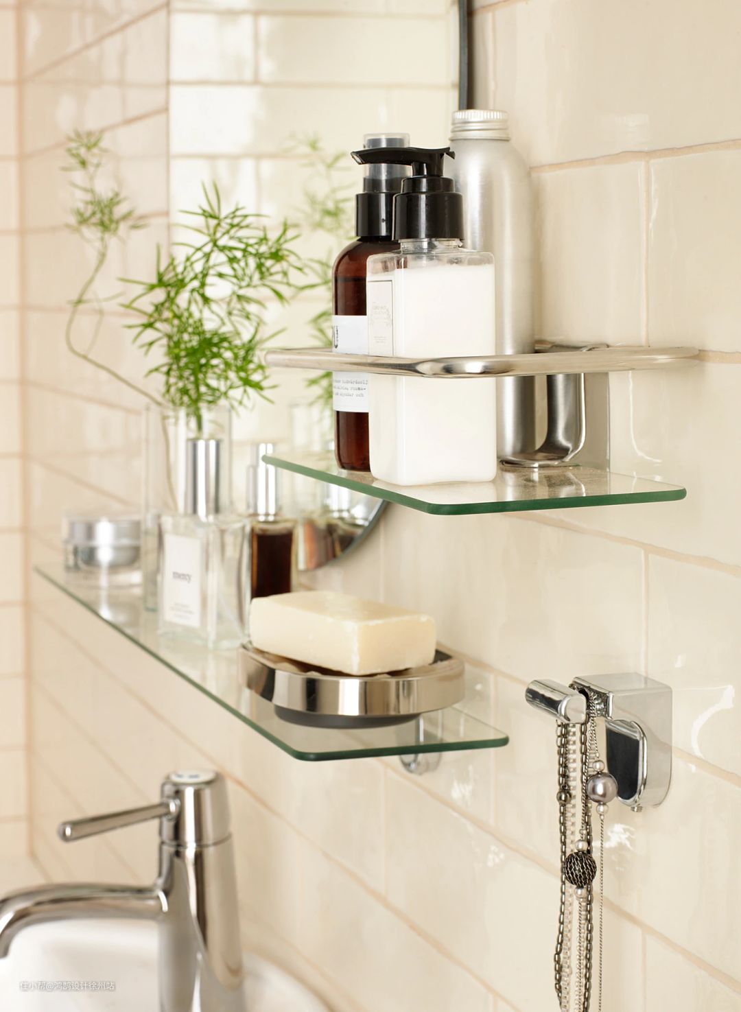 宜家凯伦德系列的浴室收纳件,隐藏的螺丝安装,加上闪亮的镀铬材质,易于清理,也提升了浴室用品的质感。
