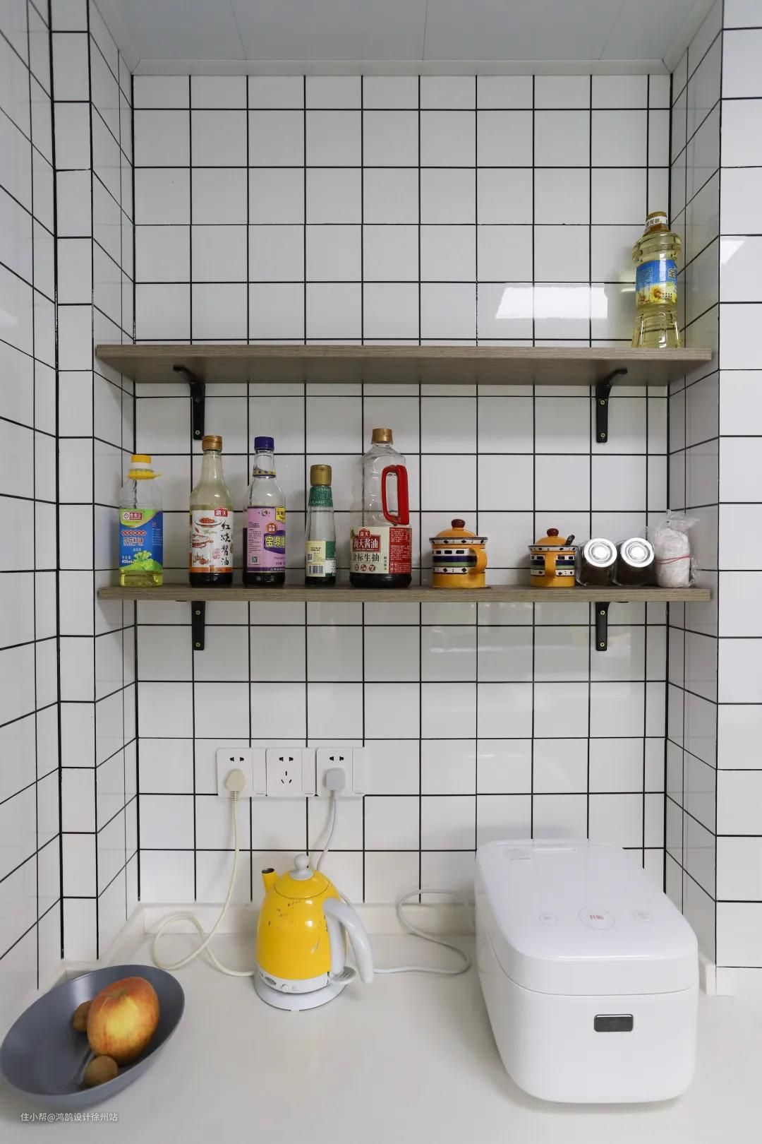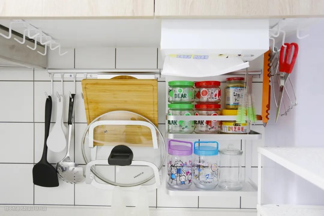 冰箱旁、台面上方、橱柜下方,凡是可以看到的墙面,都可以想办法利用起来。