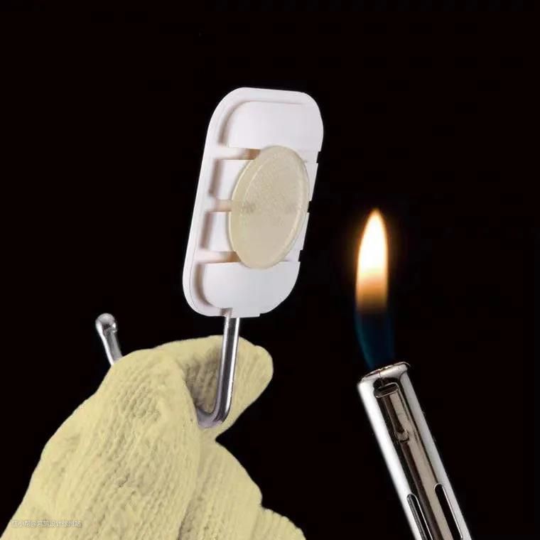 用打火机来回移动加热挂钩背部的粘胶,大约20秒,等胶均匀融化后尽快贴在墙面上,用力摁紧,放置1小时之后再悬挂物品。
