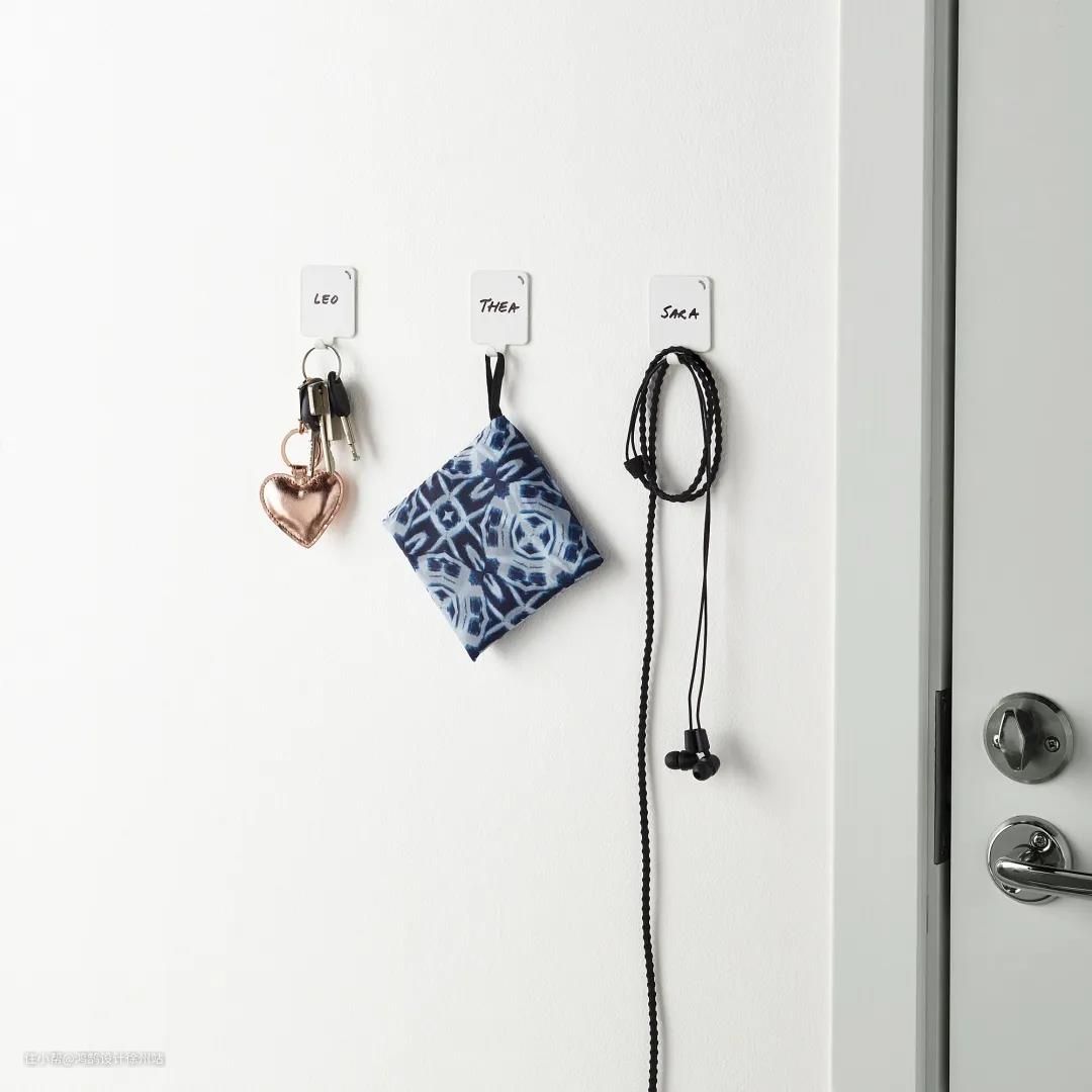 宜家的普鲁特自粘挂钩,还可以在挂钩上写字标记所挂的物件,出门一定不会忘记带了。
