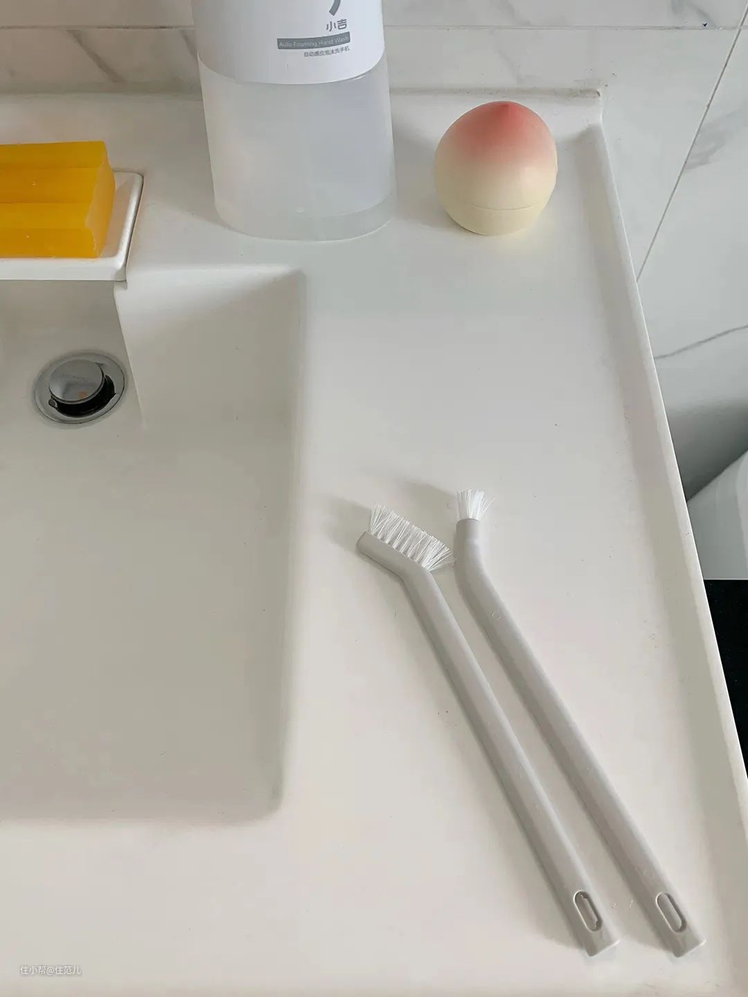 住范儿客户Aima家用的就是这种,MUJI缝隙清洁刷系列的小刷头款,用来打理洗手池容易有卫生死角的下水口超级方便好用。