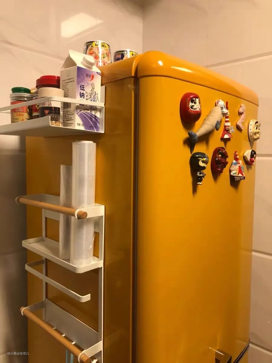 看看冰箱侧面空间就知道,利用带磁铁的收纳盒直接贴在冰箱表面,总能有不占空间的惊喜。