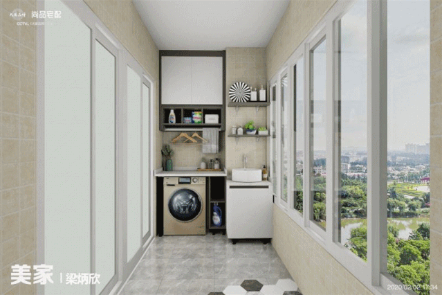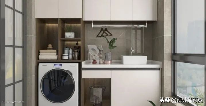 阳台一边设计洗衣池+洗衣机+收纳地柜+吊柜/收纳架,另一边做顶天立地的收纳柜,专门放簸箕、扫把、吸尘器、换季杂物等物品。