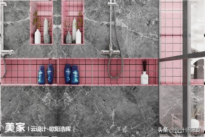 淋浴区可以设计壁龛,放洗发水、沐浴露等日常洗护用品,还有毛巾等物品。壁龛深度要在15-20cm之间,也就是墙面厚度至少要30cm,并且是非承重墙。