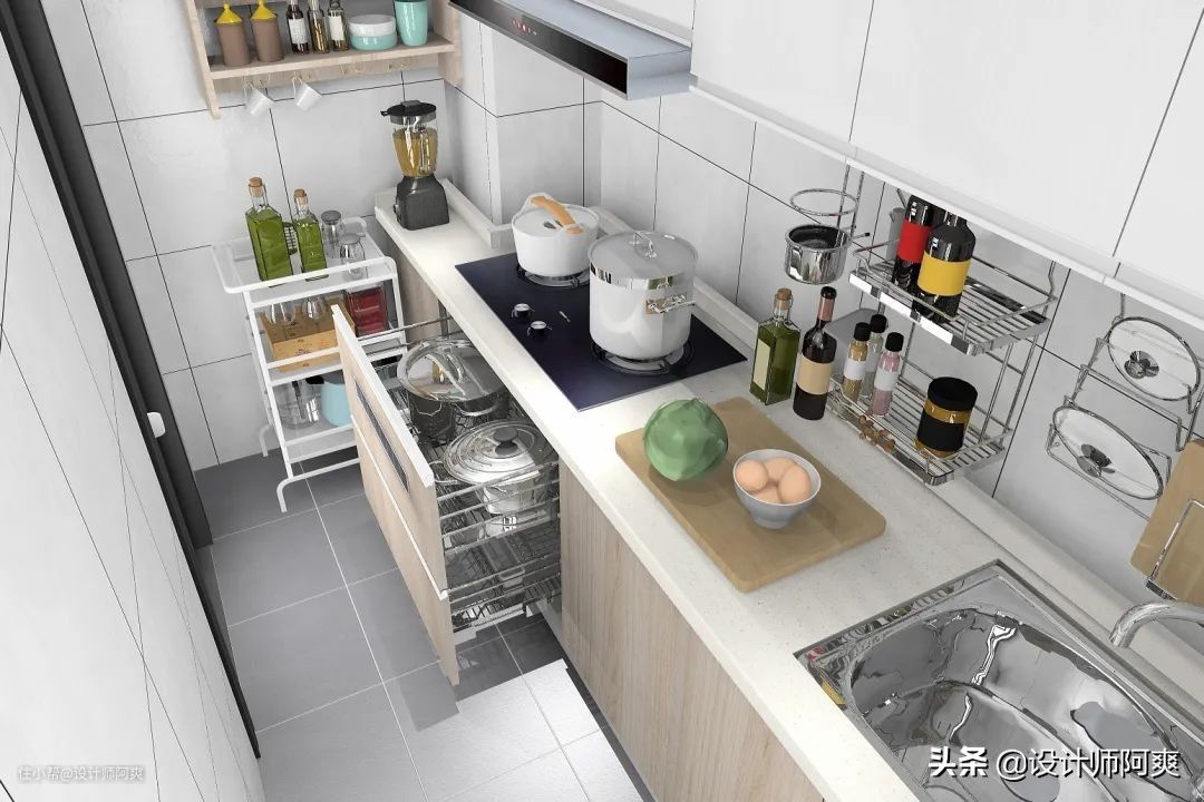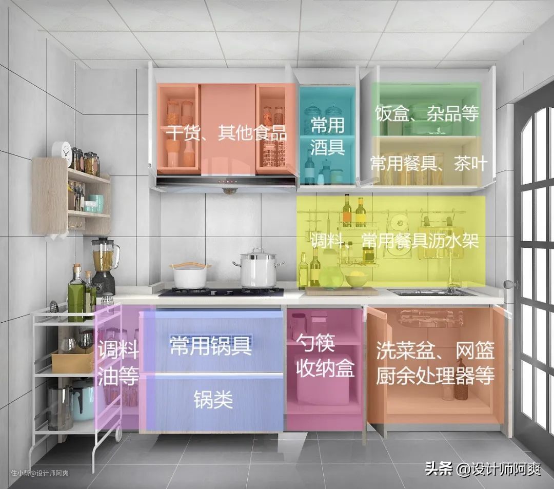 ②锅具、耐储存的食物放地柜,备用、不常用的物品放吊柜,常用调料或厨具可上墙收纳,充分利用墙面空间,小推车可以放置蔬菜和小电器;