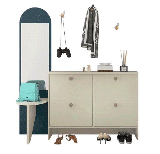 柜门做镜,综合利用空间;柜底悬空高度加高,可以放换鞋凳;鞋柜内部做可移动搁板,鞋子斜放充分利用顶部空间。