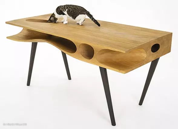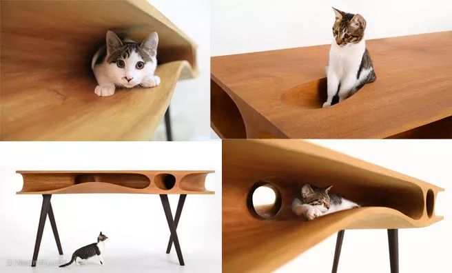 零壹城市建筑事务所就曾推出过一款特别的——猫桌,这既是一张可以供人类办公、吃饭、喝茶的普通桌子,又给好动的猫咪增设了许多通道,甚至可以让猫奴们面对桌子“打地鼠”。给主人和宠物带来许多互动的可能。