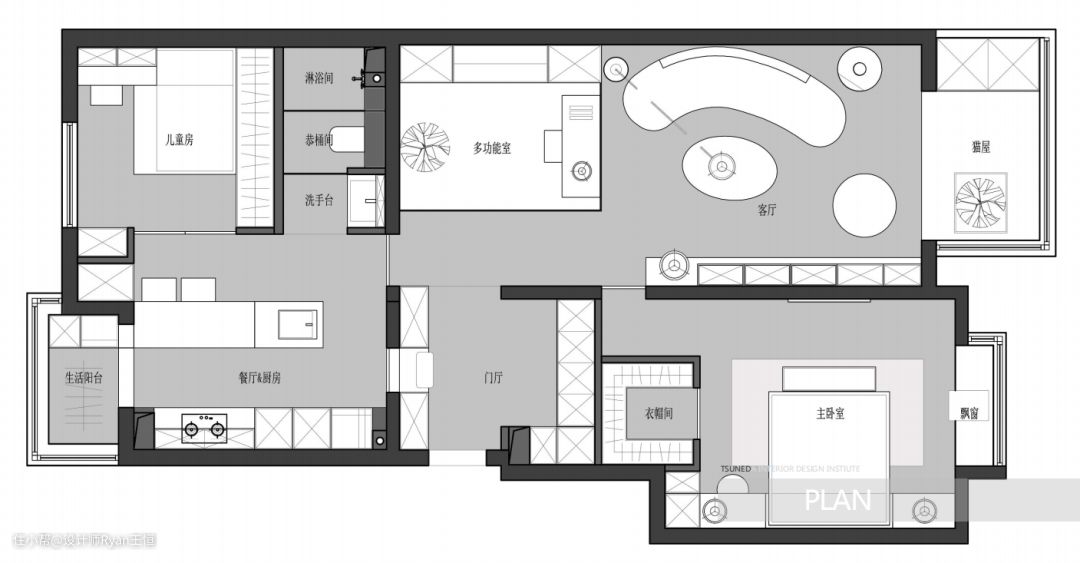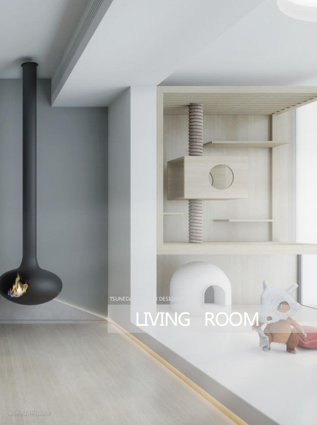 入户后的多功能室、客厅、猫屋三连一排,给了猫主子满满的存在感。