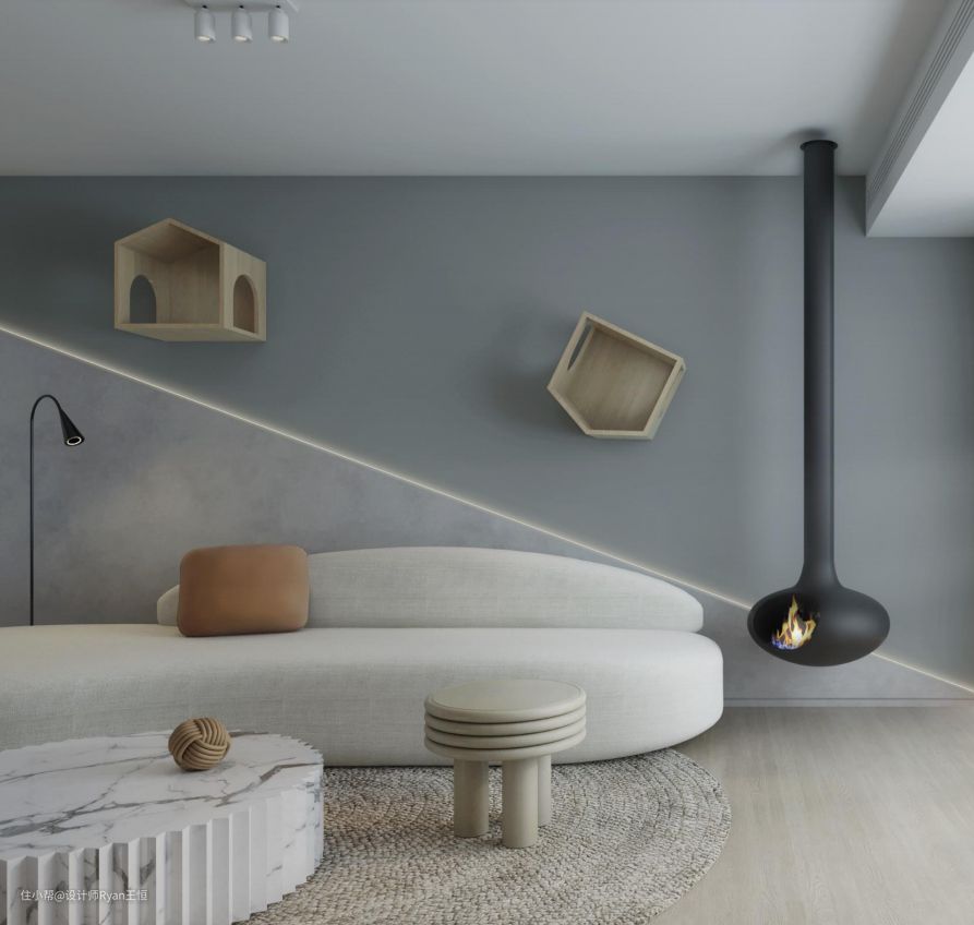 用不同颜色的墙漆和灯线对沙发背景墙做出了分割,上区作为猫咪的领地,安装上两个童趣的猫爬架,十分活泼。