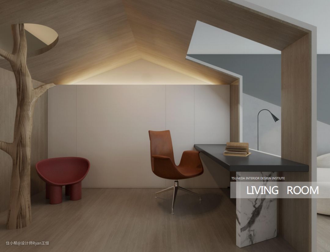 设计师用板材做出了一个房顶的造型,并且让一棵大树破屋而出,营造出自然的勃勃生机。