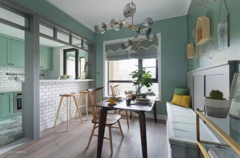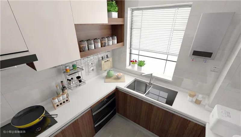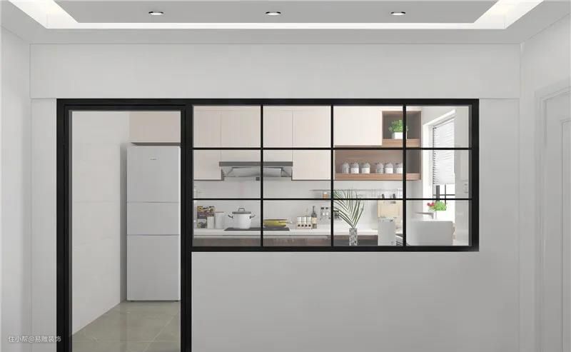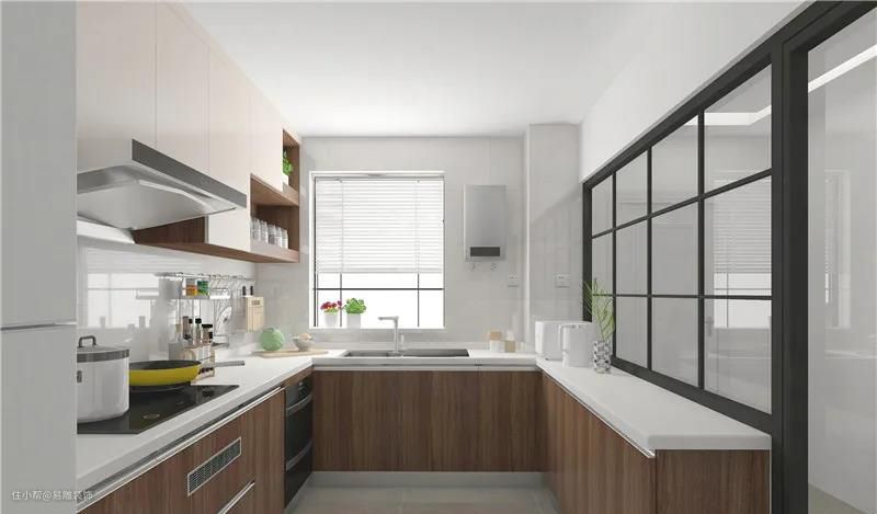 增加一排储物柜,实现功能分区。把墙改为透明玻璃门窗,增大采光面积,既阻挡了油烟又不影响与餐厅的互动交流。