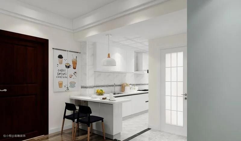 厨房与客厅用吧台做隔断,不但可以帮助厨房分区,还能丰富厨房的功能,增强实用性。空间不大的厨房,吧台还能充当临时备餐区和餐桌,一举两得。