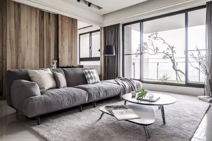 除了根据墙面定颜色之外,还可以根据窗帘颜色来定。如果墙面颜色是白色,不想要百搭色,就可以跟窗帘同色。这样客厅就有相似色,保持一体性。