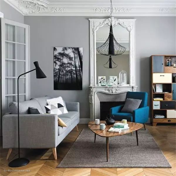 2.黑白灰的经典搭配。墙面为白色时,沙发可以选择灰色、或者黑色搭配,这是永远不会出错的颜色。