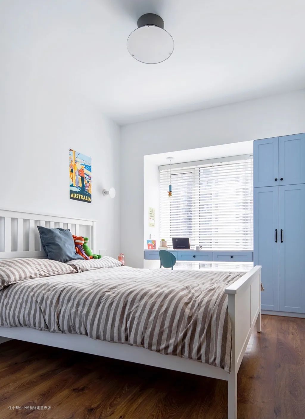 飘窗的深度一般都在60cm左右,正好是一个书桌的深度,做一个悬挂式的写字台实用还好打理。要注意的是如果飘窗的长度大于1.5建议做类似的大衣柜衔接,不然后期会比较容易变形。