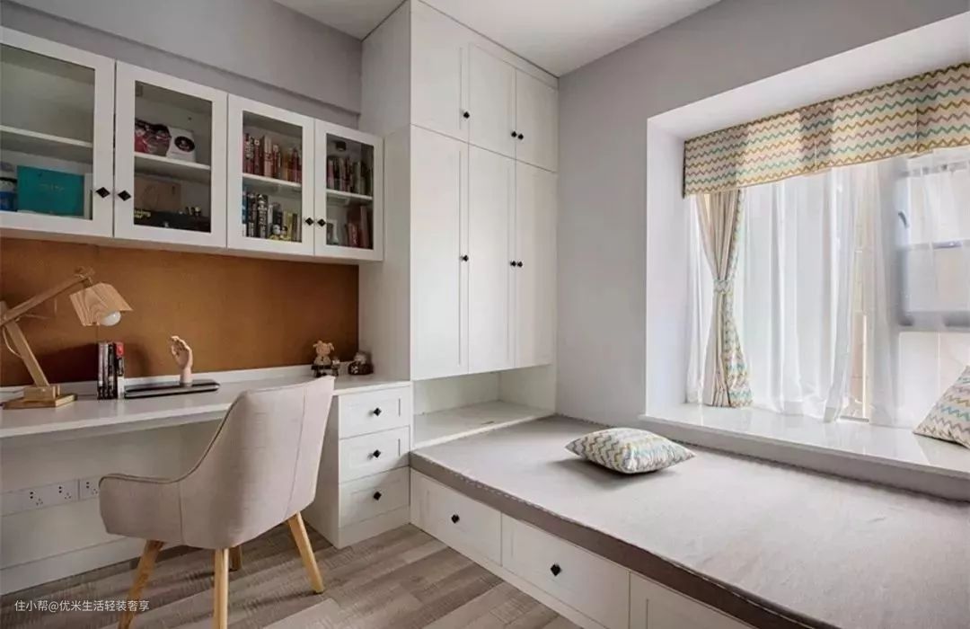 4. 卧室做书房。通常出现在次卧或儿童房中,可以将书桌、书柜与床体有机结合,节省空间。