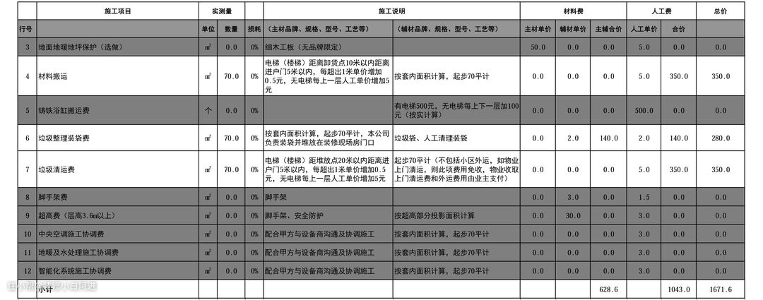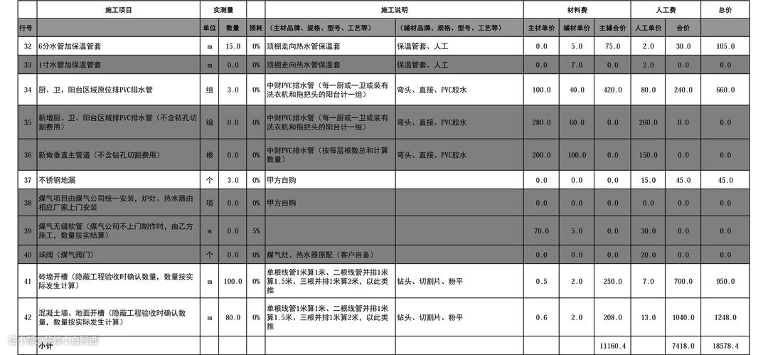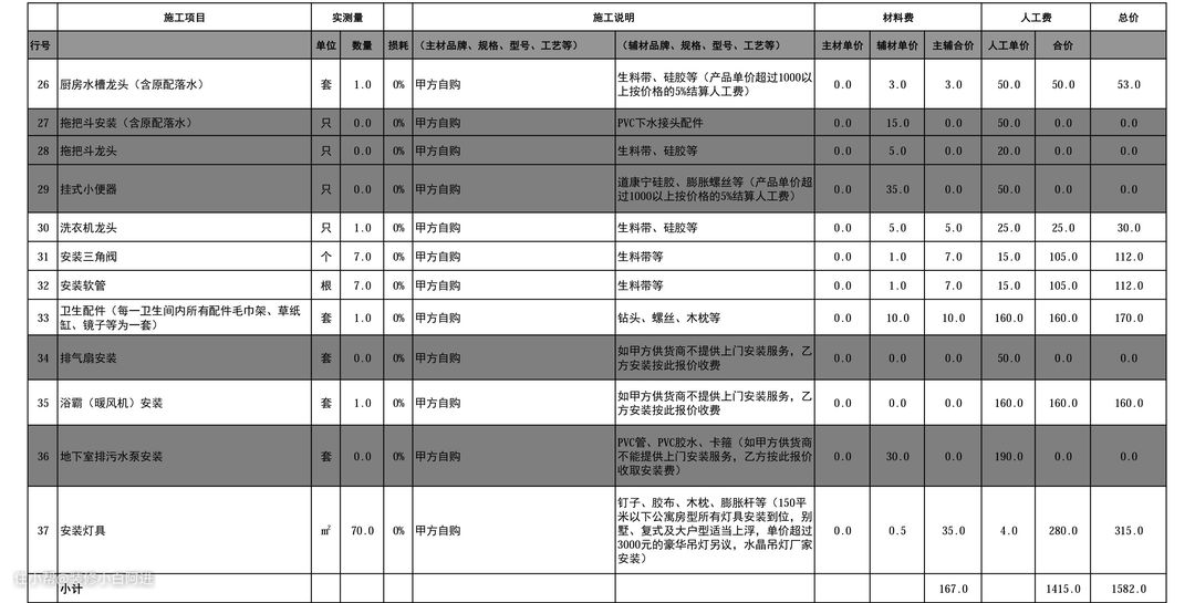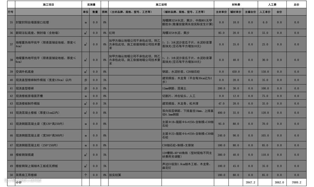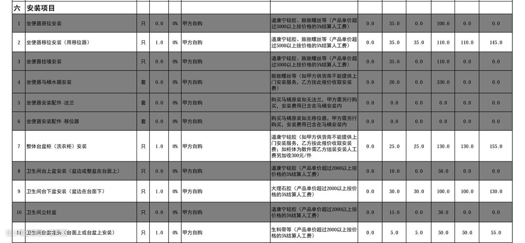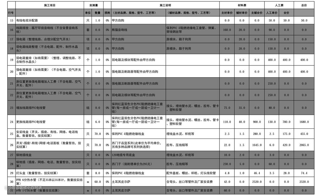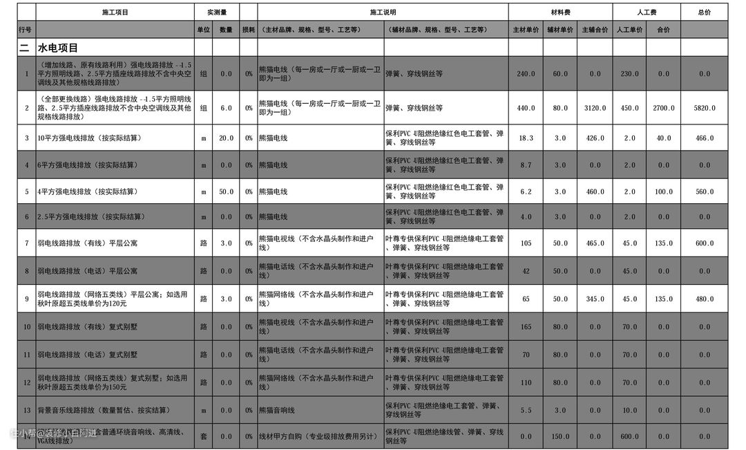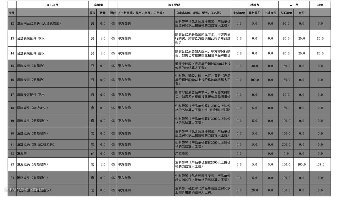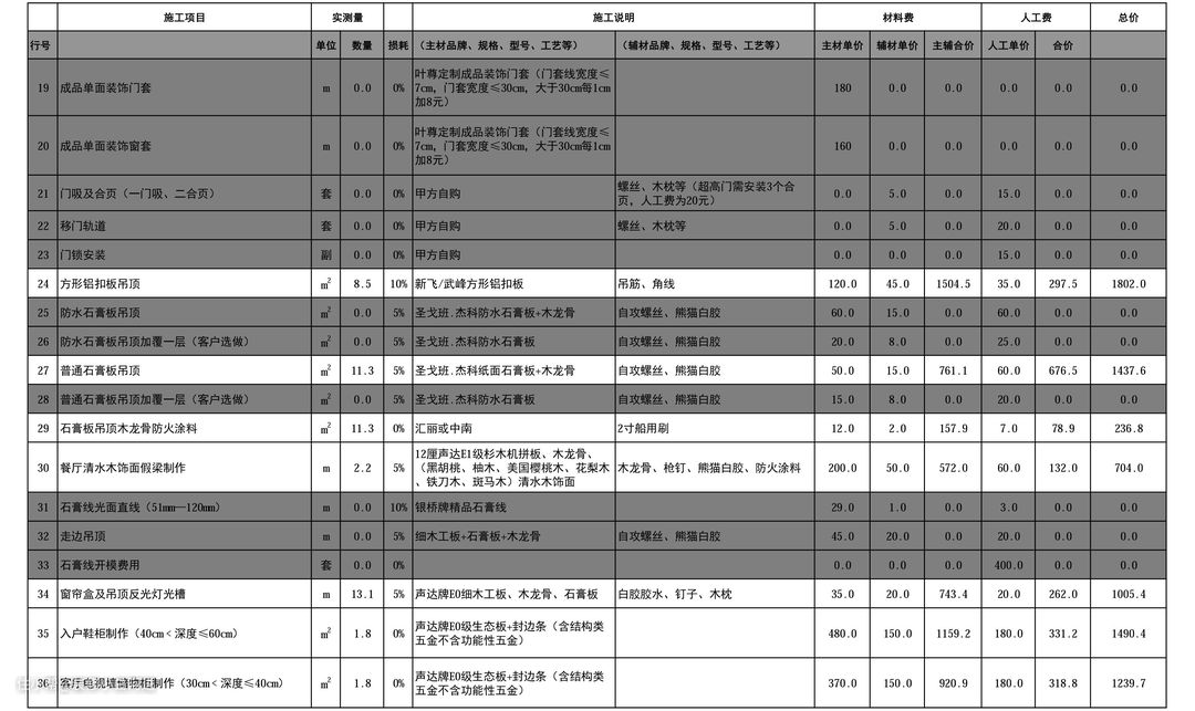 预算表上面很多工程量为0的,这代表着你不做,但是后面单价是有的。如果,我本来不打算吊顶高的。临时想装射灯,吊顶,那么增项费用是跟着预算表上的单价走的。这些单价提前比较下,不然到时候吃哑巴亏。