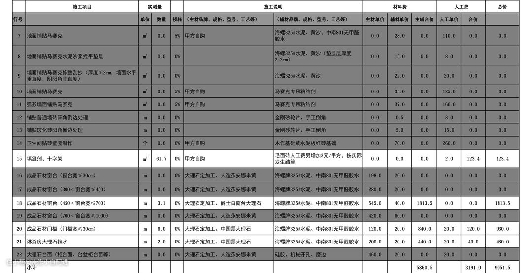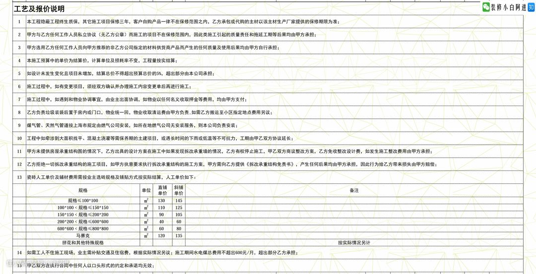 这个瓷砖规格铺贴费用算比较详细的了,还可以加入“地砖上墙”的费用到表里面,就完善了。