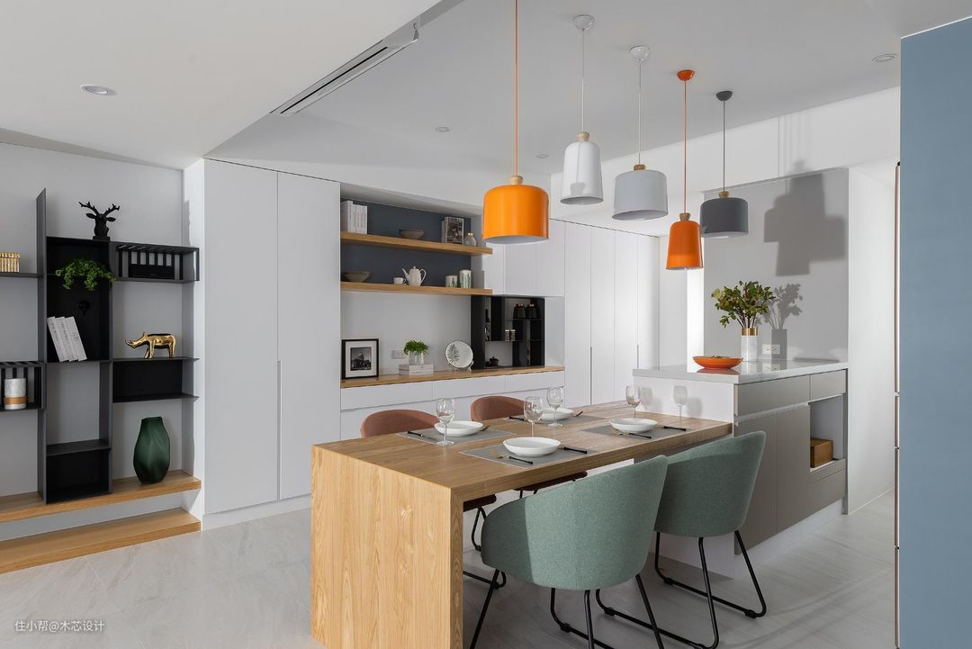 岛台是很多开放式厨房喜欢配置的设计,在面积不大的基础下,它却是有着相当实用的实际功能,跟餐桌结合起来也是格外的合拍。
