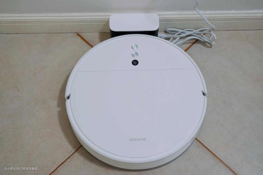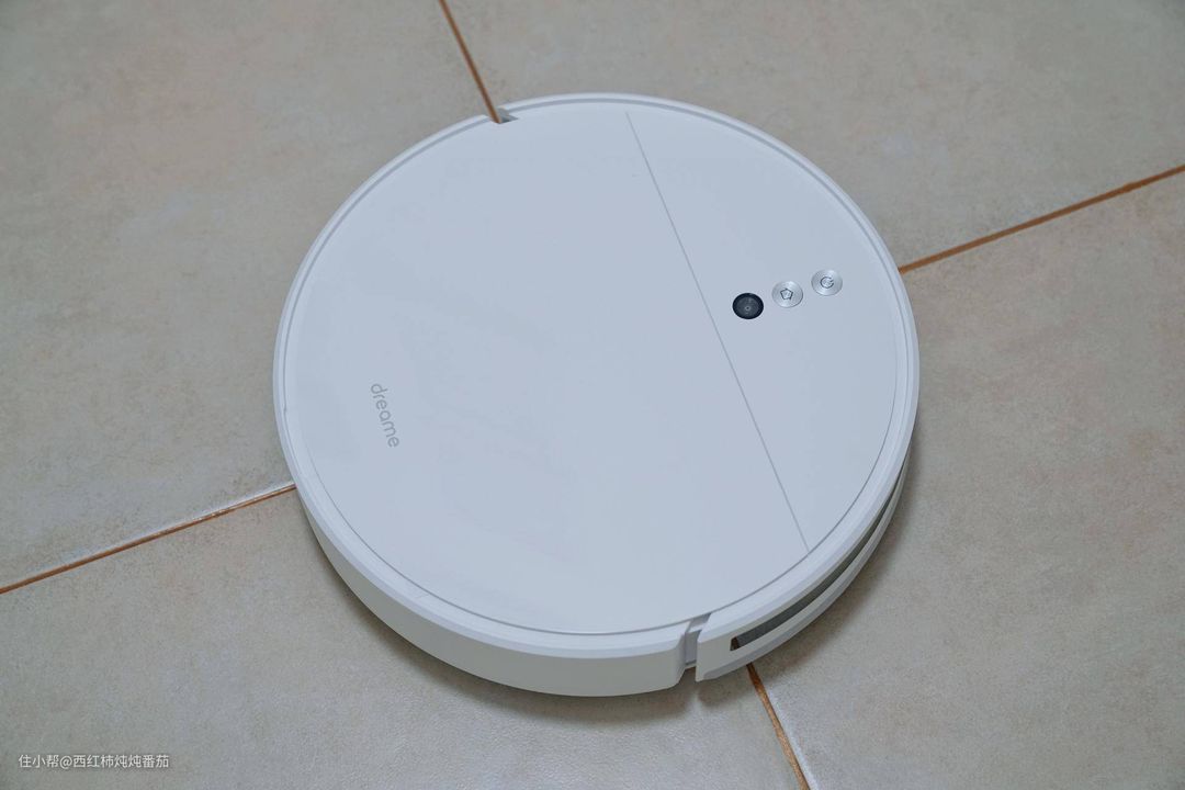 直接看主机。主机顶部面板分两个部分,上半部分两个按键以及一个与按键相同尺寸开孔的摄像头;下半部分白净素雅,仅有一个 Dreame的 LOGO ▲
