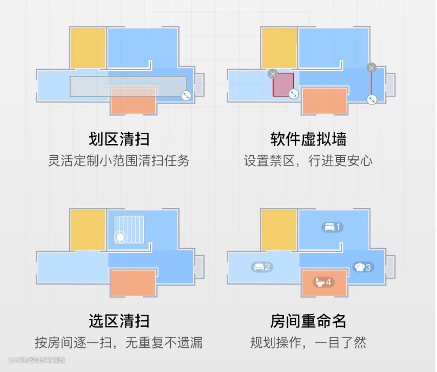 另外,机器人支持划区清扫,支持虚拟墙设定,支持选区清扫,支持房间重命名。几乎所有其他旗舰款机器拥有的功能,他也一个不少的拥有 ▲