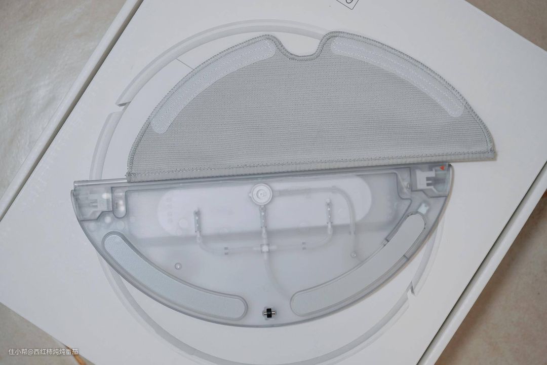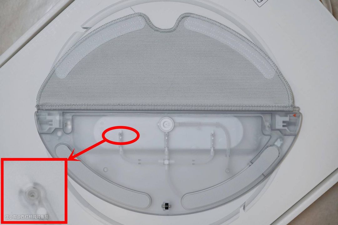 拖布和水箱模组之间采用导轨+魔术贴双重固定。从造型和尺寸来看,与市面上其他同类产品的耗材应该是通用的;水箱采用电控出水,可以保证出水更加均匀稳定;另外,在水箱端部有一个小小的黑色滚轮辅助滚动 ▲