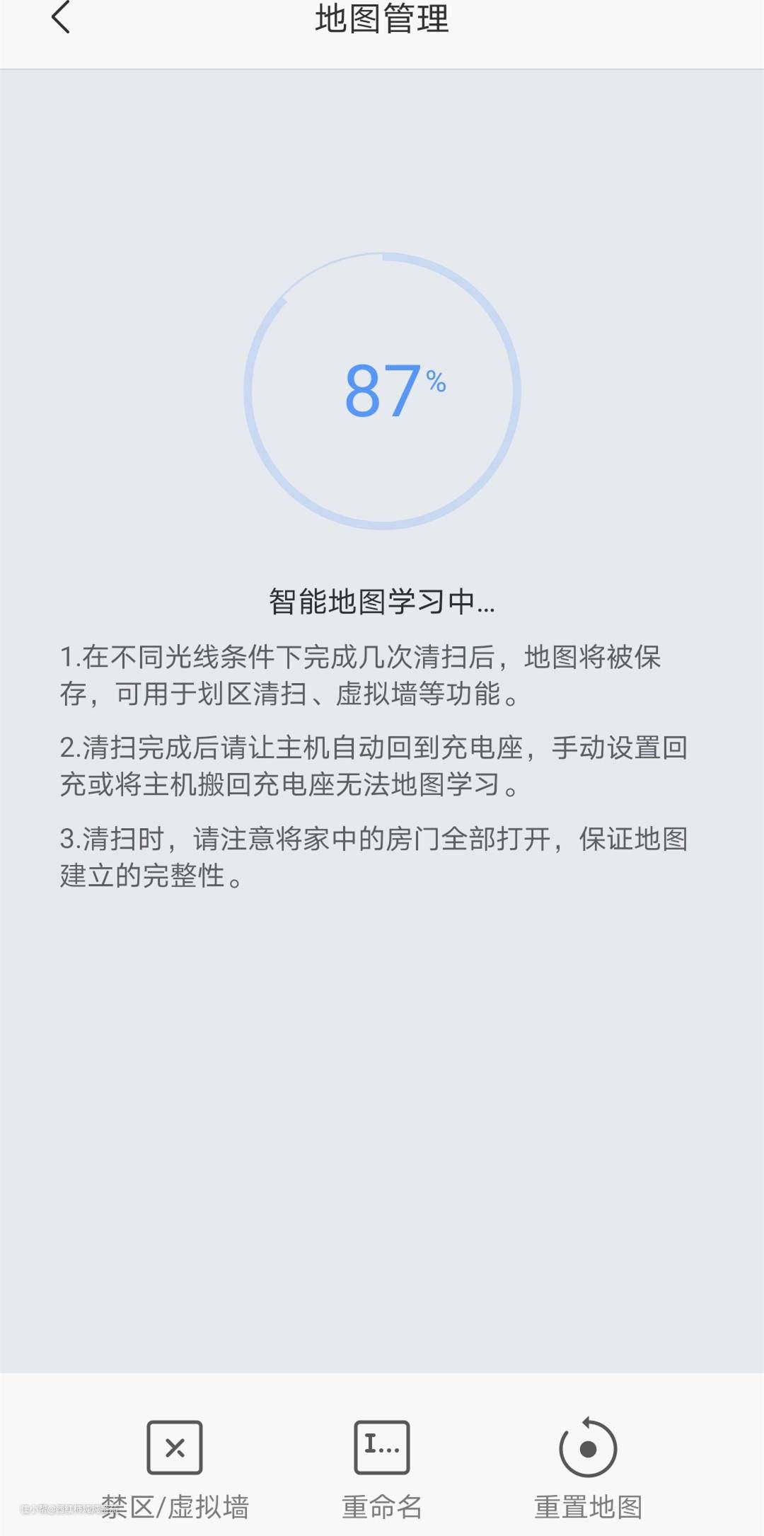 以楼主的使用经历来说,机器在经历了 4次完整清扫周期后,这个进度依旧才完成 87% ▲