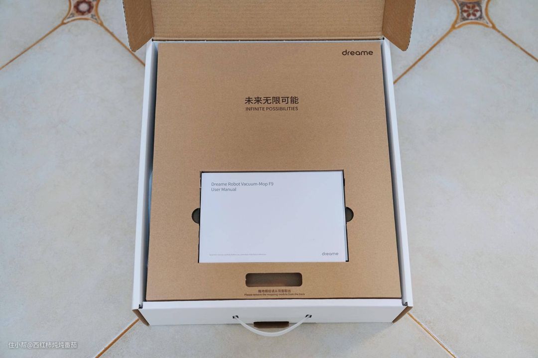 开箱,里面的东西分两层,上层是说明书和水箱模组,下层则是主机、充电底座等。产品 Slogon:未来无限可能——Infinit possibilities,听起来颇有远大抱负 ▲