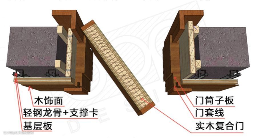 根据上面的门套解构图,我们就等于知道了一个门的工艺类型主要包括哪些部位,还是本着主题学习的思路,我们来分解下装饰门套的构造做法。