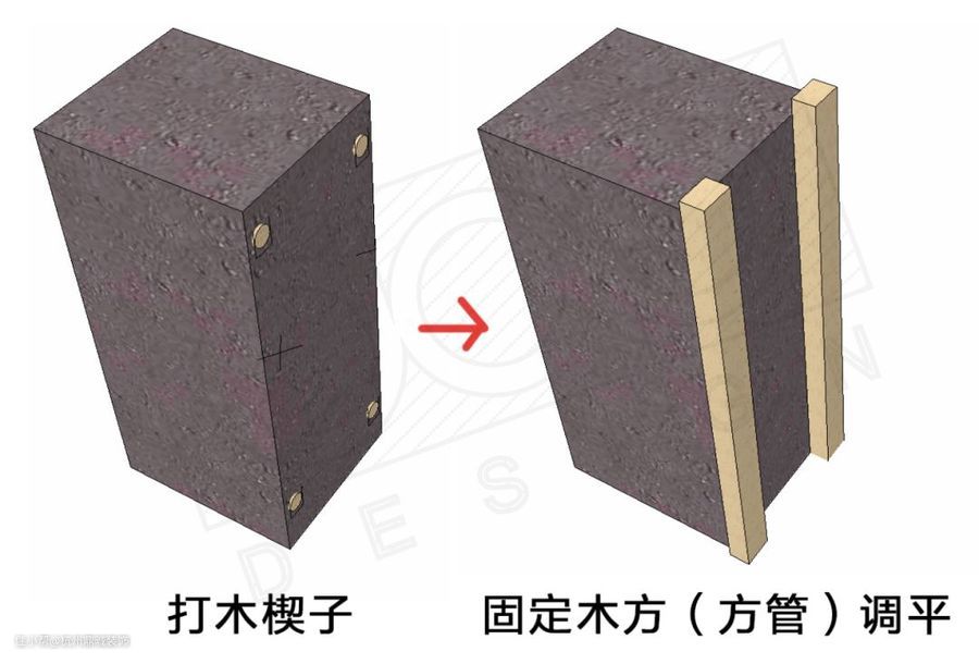 ① 先通过木楔子、木条或抹灰修补等方式来对门洞进行找平处理。