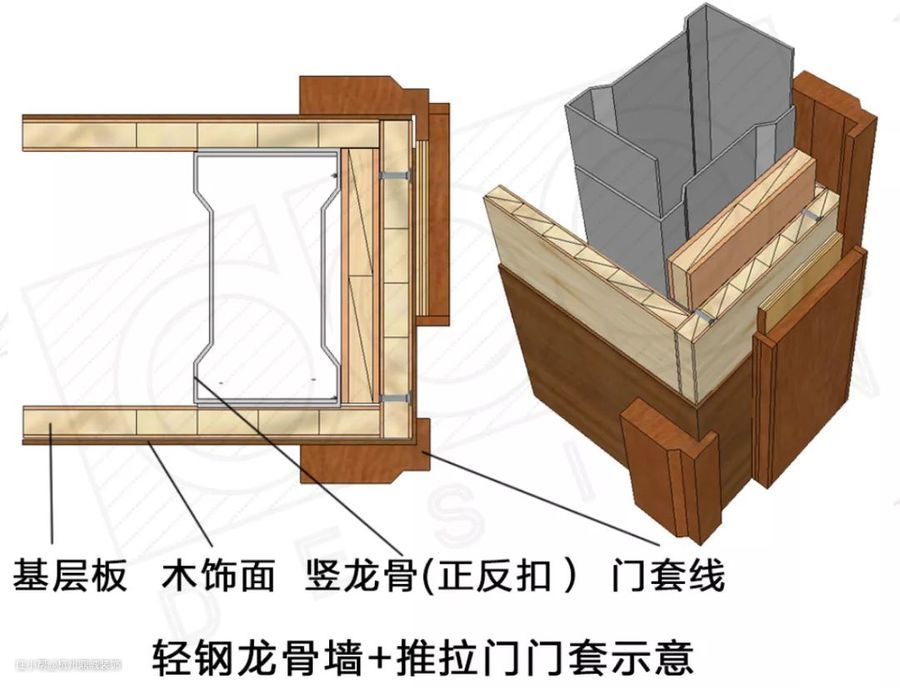 当墙面基体为轻钢龙骨隔墙时,通常情况下有两种做法来保证轻钢龙骨墙体的强度,用于固定门套。
