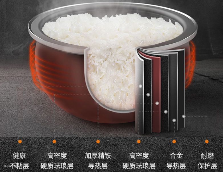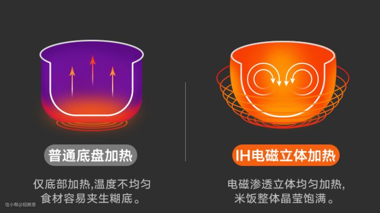 IH电磁加热:利用电磁线圈直接对金属内胆加热,减少热量损耗,所以加热速度更快,更均匀,米饭口感会更好,但价格偏高。