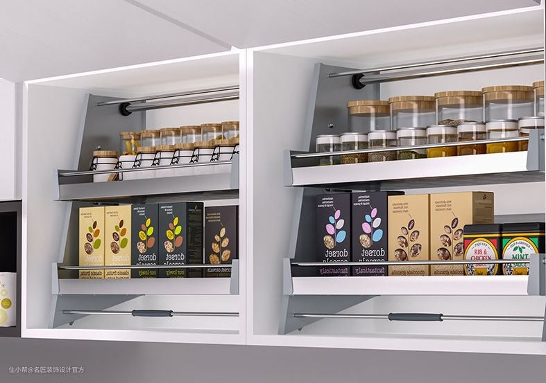 如果自己平常有点懒,懒得归置这些储物盒,那么您可以考虑为吊柜加装升降篮,合理的将物品摆放在升降篮中,拿取时升降篮可以移至最为舒适的位置,十分方便也可以很好的提升吊柜的收纳能力。