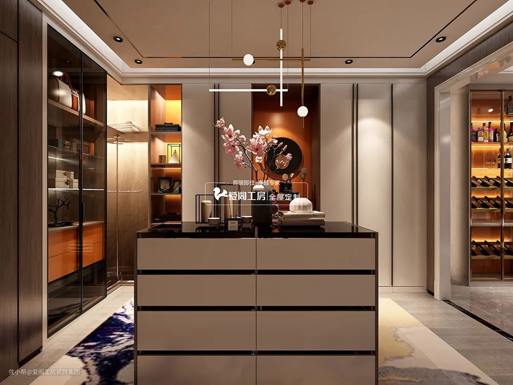 衣帽间采用白色与木纹的撞色,尽显优雅知性美。点缀的爱马仕橙则以高贵华丽的皮质纹理,为衣帽间注入了经典时尚的气息。