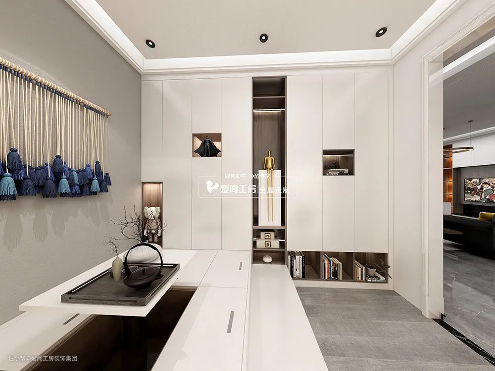 平衡,是对空间尺度的思考。玄关柜大面积留白,凸显黑灰熔岩河流木纹,展现了对空间尺度的把握和块面关系的灵活统筹。空间彼此连贯,色调相互呼应,于自在的空间中,美感保持同步,节奏韵律达到统一。