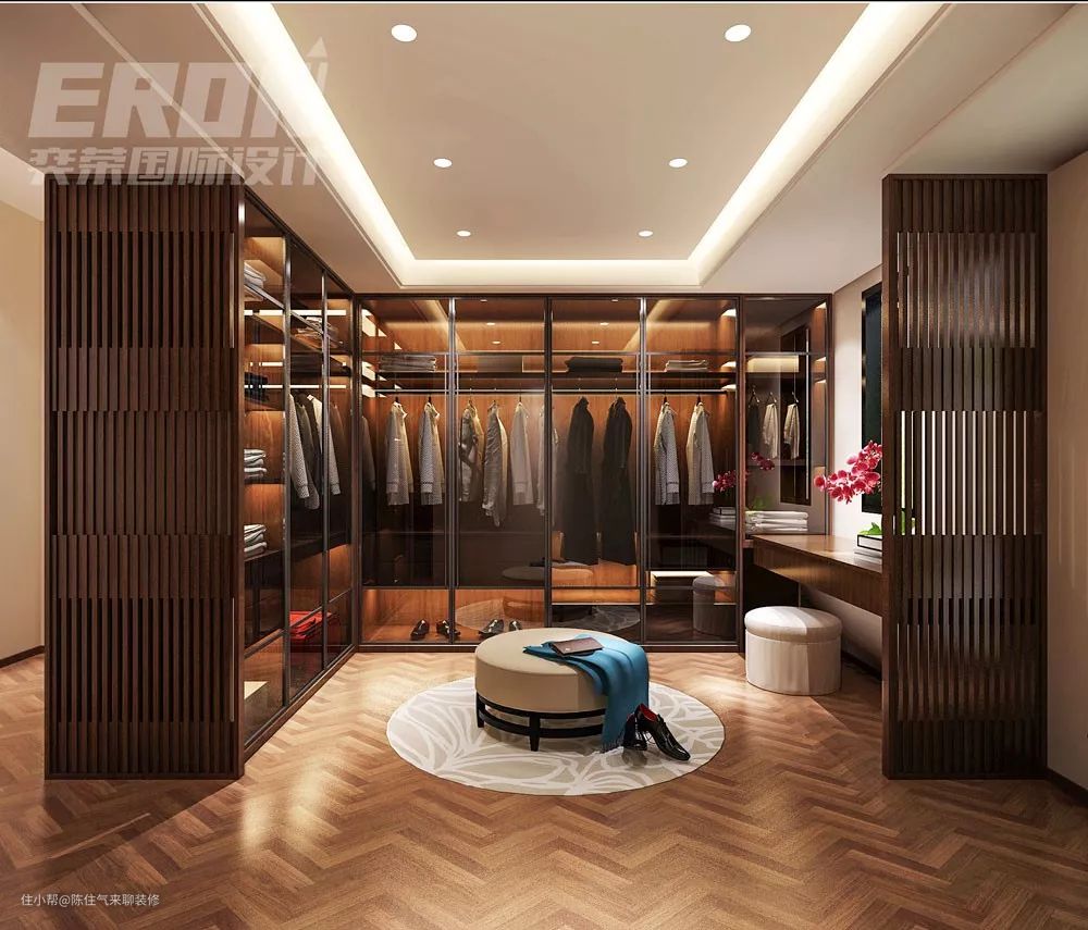 对于有些开放式衣帽间如果可以成为一个单独的空间,建议设计一个隔断门,让衣帽间处于封闭式状态,具体根据实际户型情况而定。