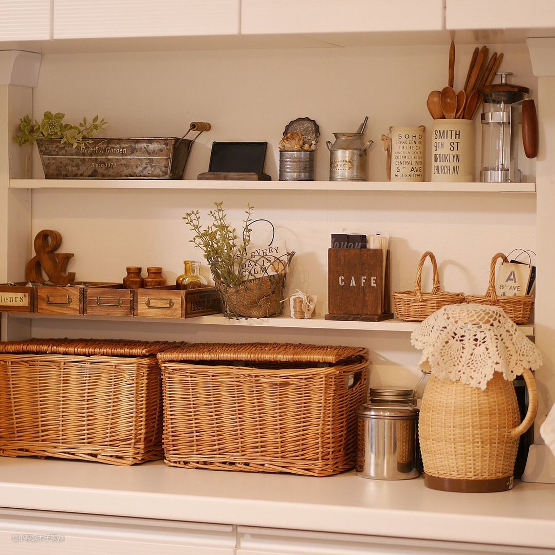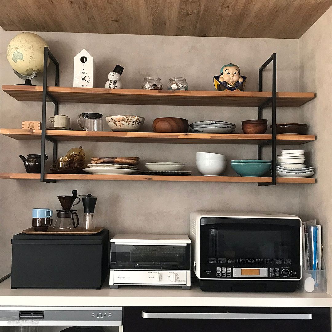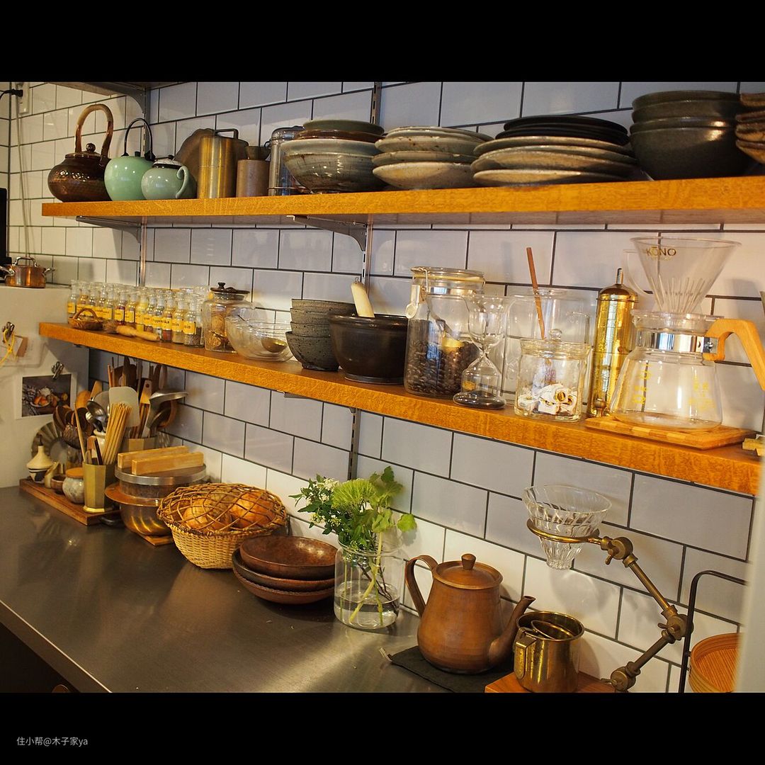 对比欧美的搁架厨房,日本人也非常喜欢用开放式搁架来收纳,减少吊柜的使用,把各种好看的餐厨具摆放出来。