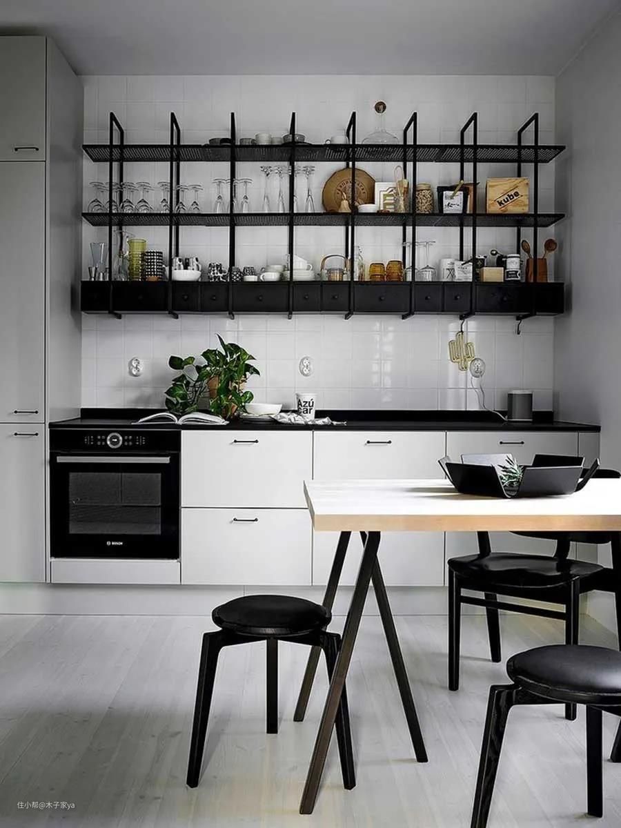 使用黑色铁架做搁架也是不错哦,适合工业风或现代风格的厨房设计。