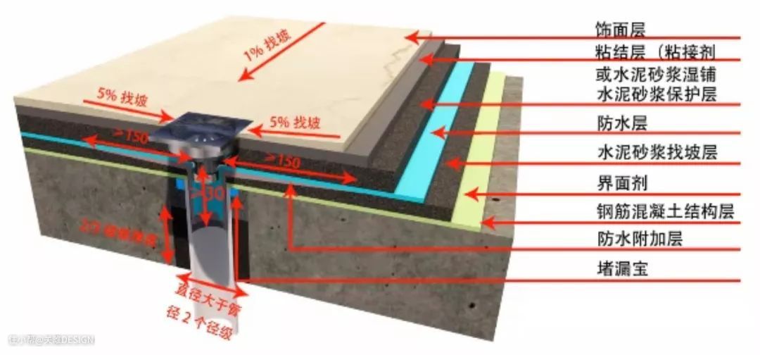 确定地漏位置→原建筑结构处理→放置堵漏宝→刷界面剂→铺设水泥砂浆找坡层→防水层→防水保护层→粘结层→饰面层铺贴