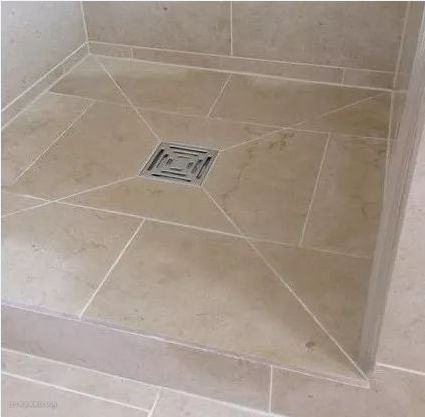 这种贴法也常见,就是将地漏的四个角对准瓷砖的十字线。这种方式整体看美观度可以,但有个缺点:不好做坡度,泄水快不起来。