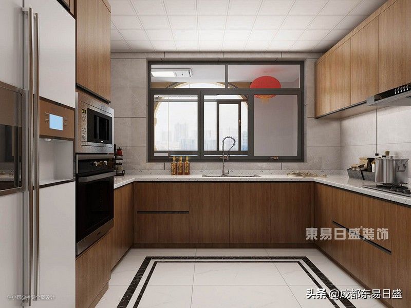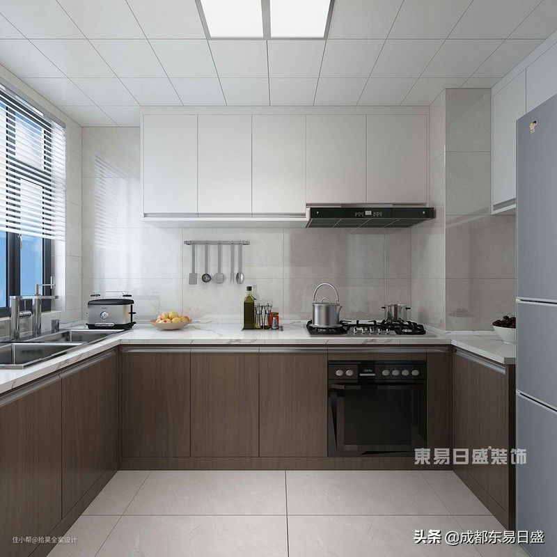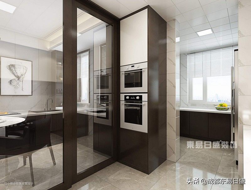 14、厨房家具采用白色水磨石台面加深色木纹,整体显得格外稳住大气,其次部分橱柜采用嵌入式。