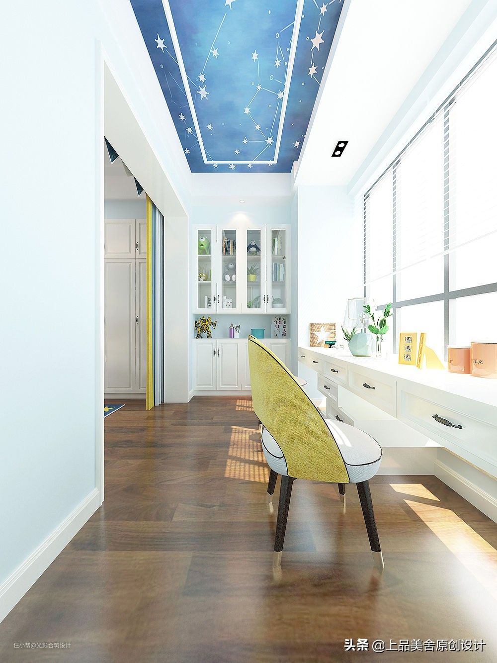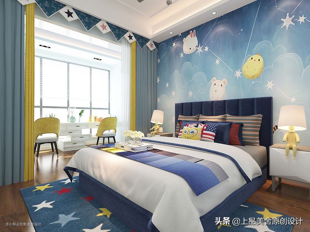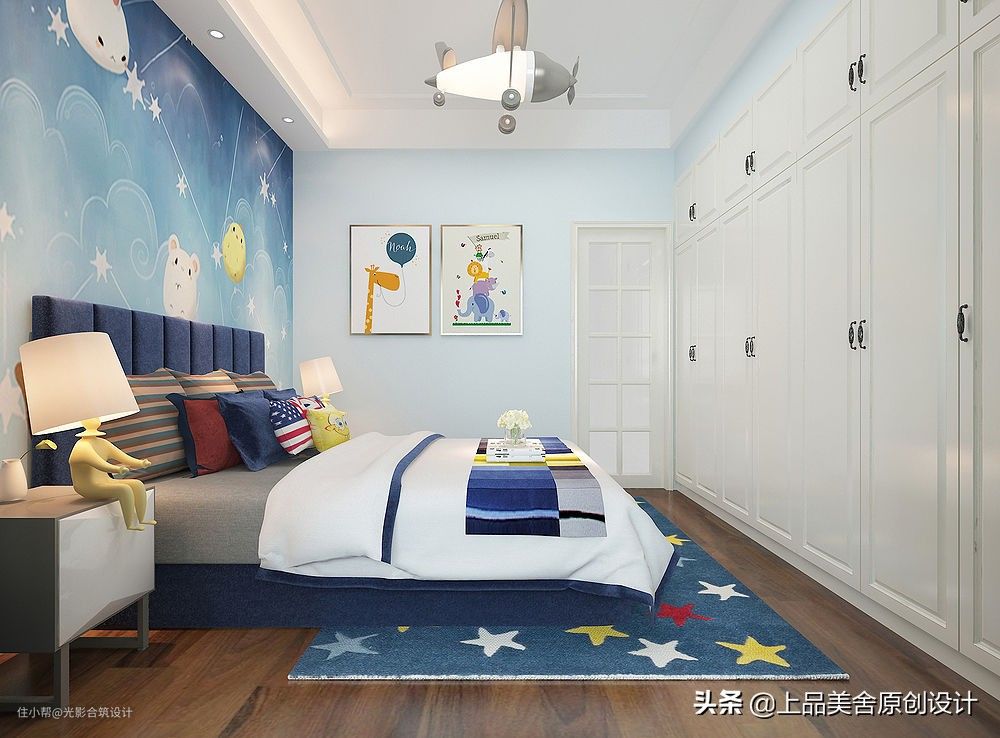室内以蓝色调为主,墙壁刷淡蓝色,床头背景用了一幅蓝色星空图案,与书房的星空吊顶相映成趣。