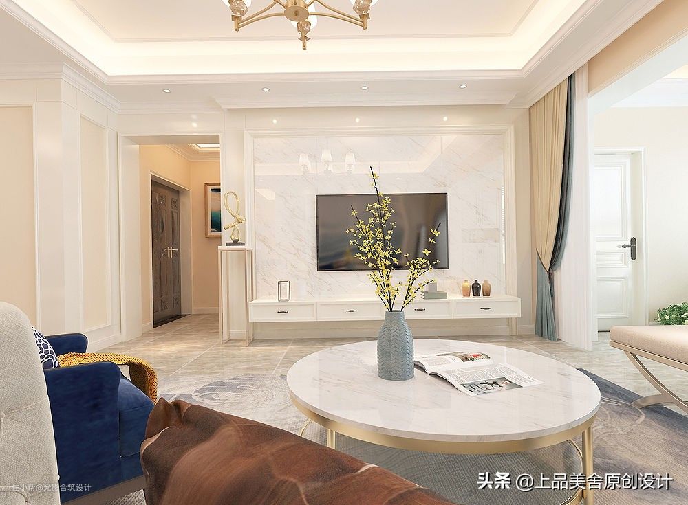 电视背景墙用了白色云纹大理石,配白色电视吊柜,再无过多装饰,简洁明了。