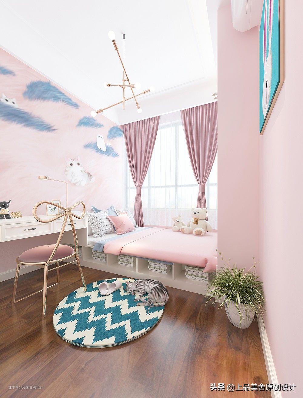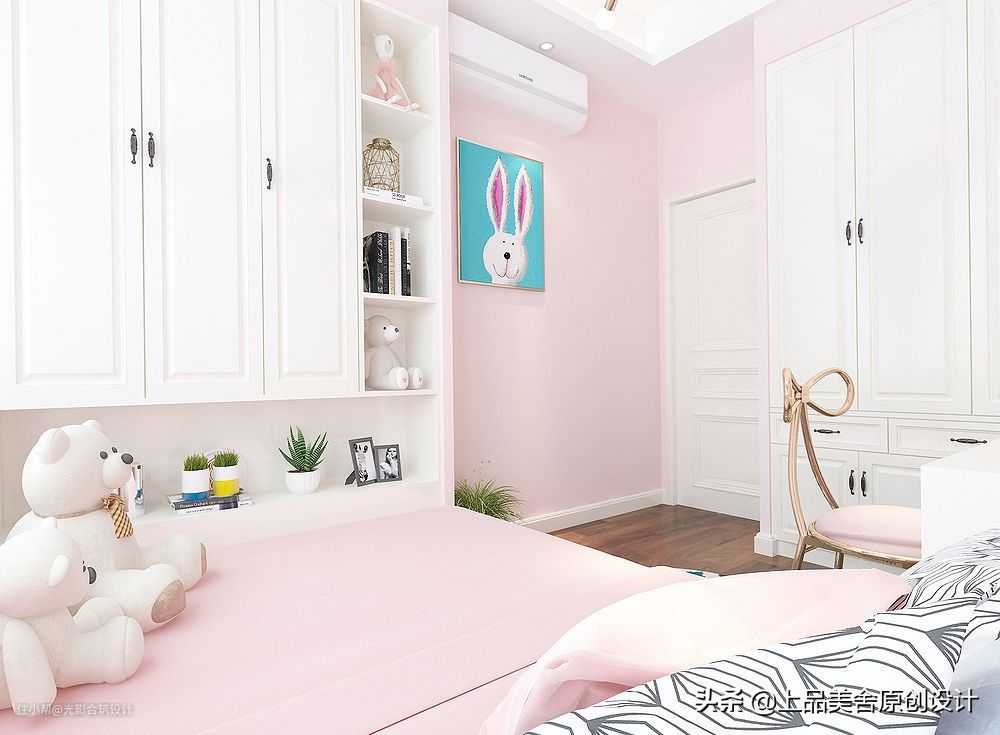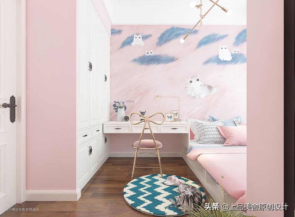 整个房间以粉色为基调,粉色的墙,粉色的床头背景画,可爱的小猫咪,蝴蝶造型的椅子,这一切都是小女孩非常喜欢的。