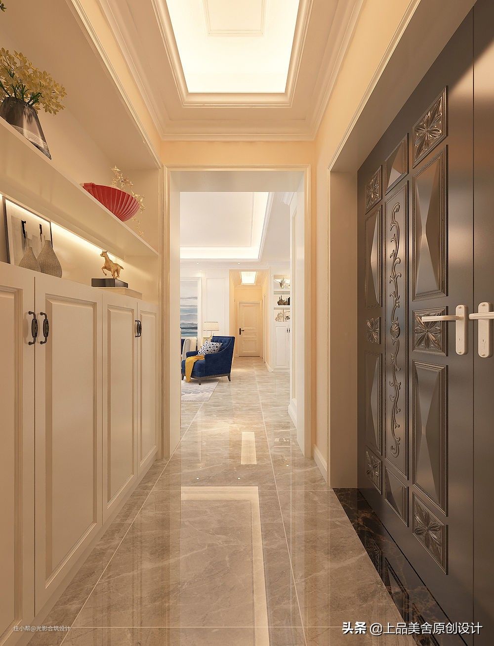入户玄关做了一组鞋柜,解决一家人出入换鞋的问题。上半部做两层留空,既可储物,又可放置装饰品,让人一进门就能看到赏心悦目的美好装饰。