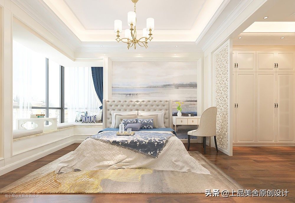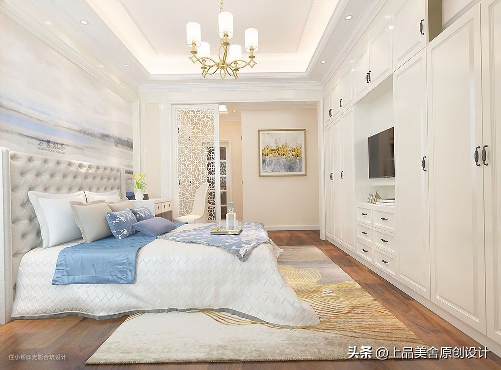 床头背景也是浅蓝色系的印象画,没有床头柜,将女主人的梳妆台放置了此处,空间实用性强。