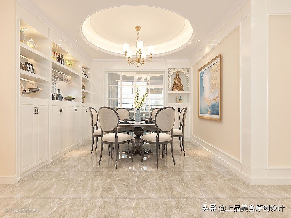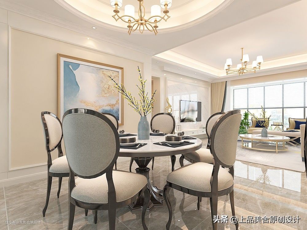 餐厅在玄关右侧,空间比客厅略小一点,整体色调与客厅一致,以白色和米色为主。